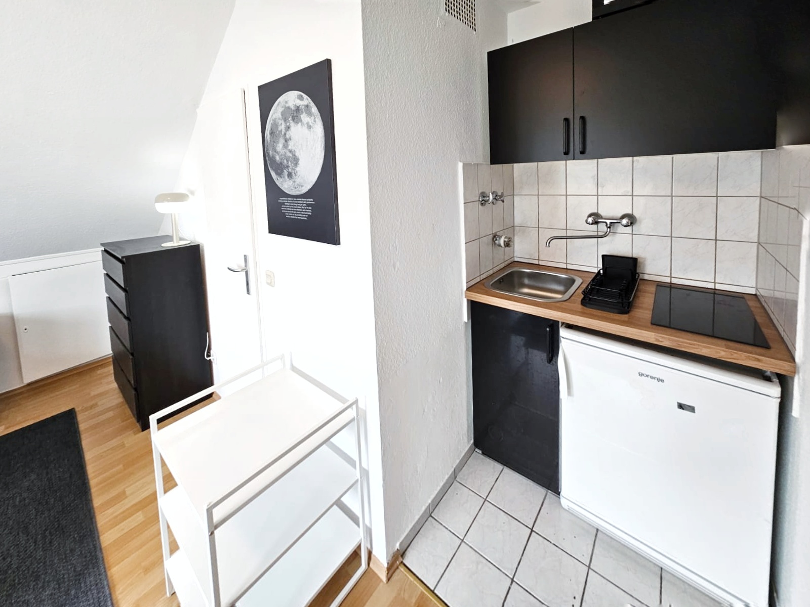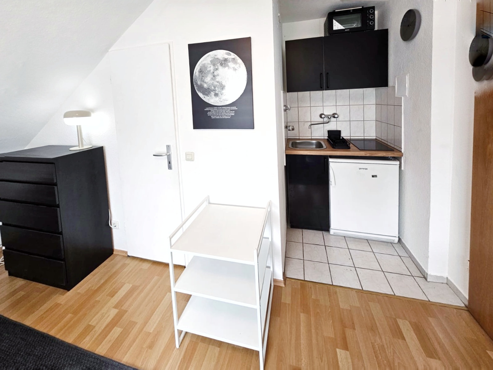 Die integrierte Küchenzeile (2 Kochplatten, Spüle, Kühlschrank, div. Ober/Unterschränke) gehört genau wie das bequeme Einzelbett , Schreibtisch mit Stuhl, TV sowie weiteren wohnlichen Accesoires zur Ausstattung dazu.