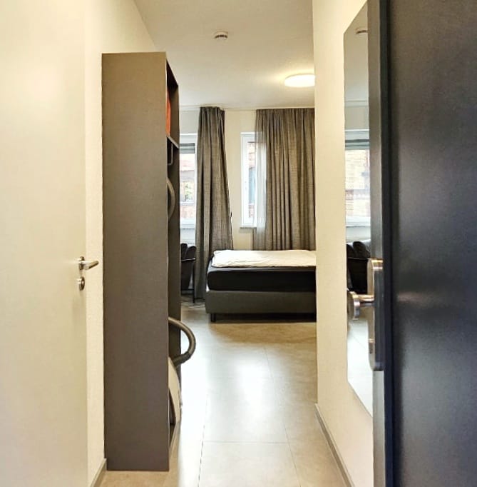 Das Apartment ist elegant und schick eingerichtet mit einer komfortablen Einbauküche, einem großen gemütlichen Bett, geräumigen Kleiderschrank, Flachbild TV, Schreibtisch mit Stuhl und weiteren wohnlichen Accessoires.