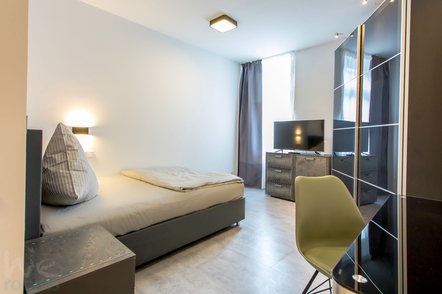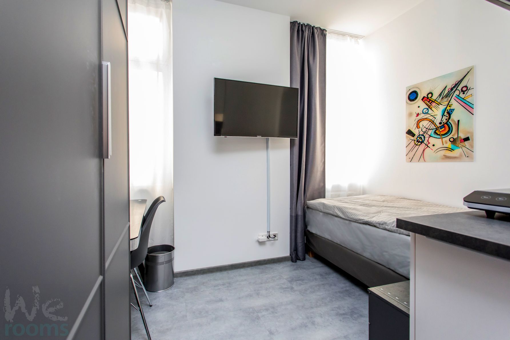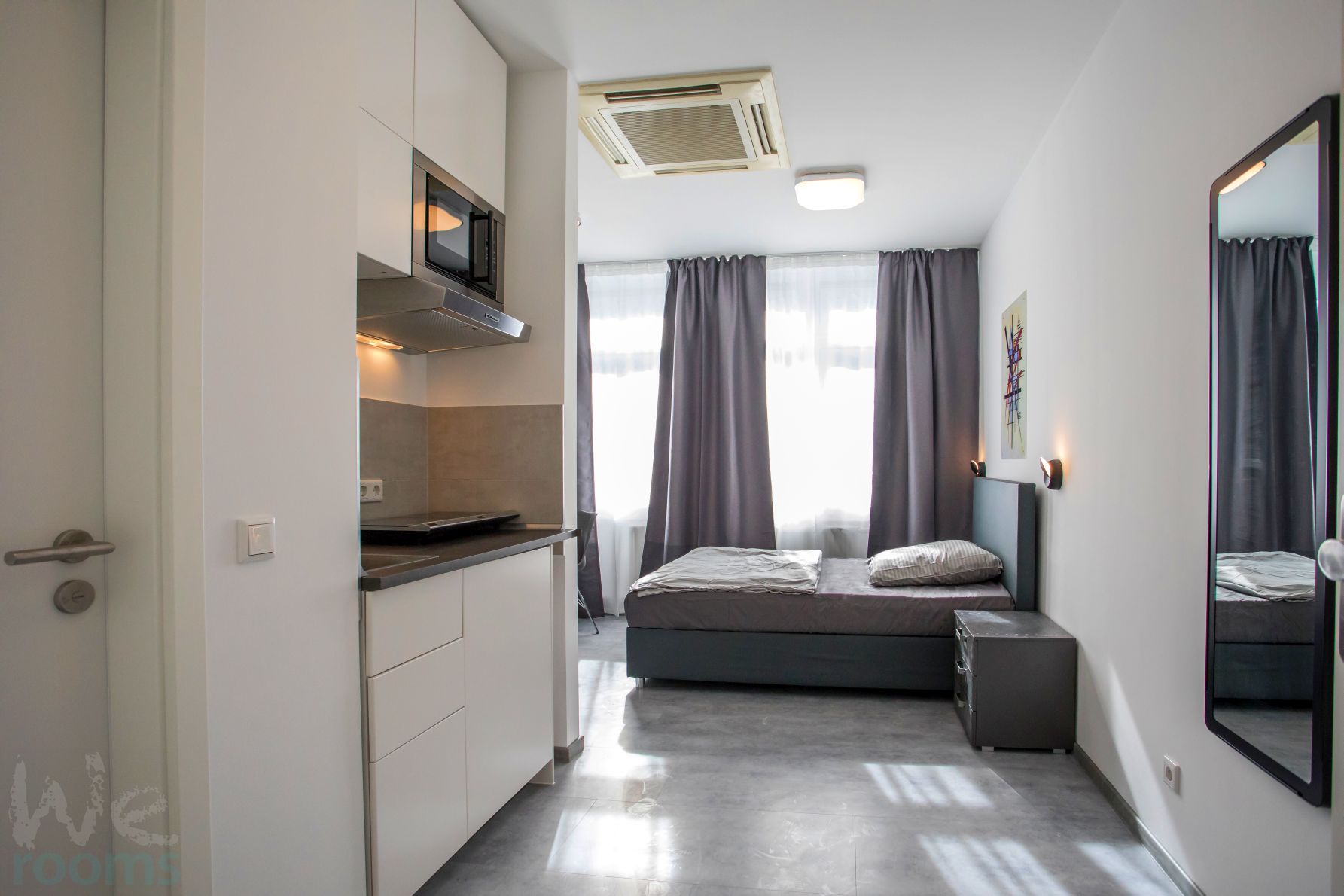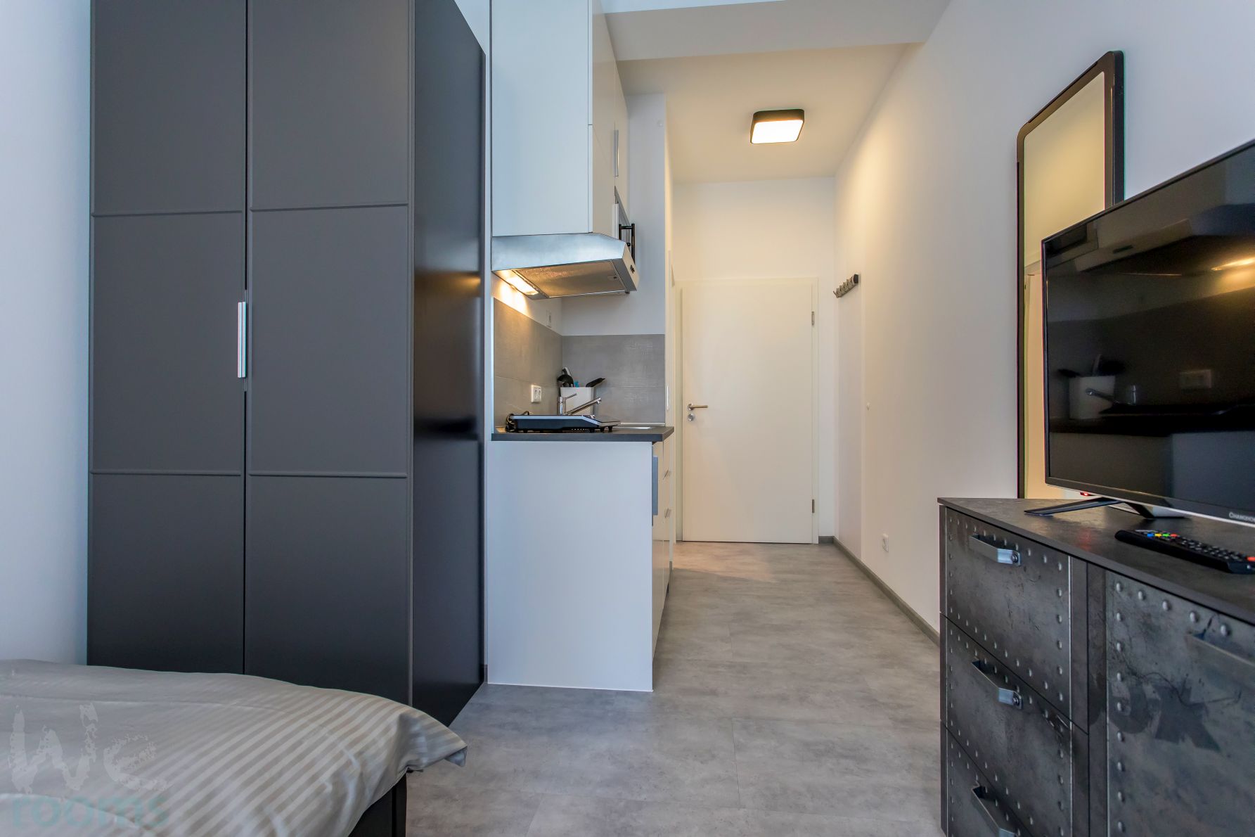 Die Ausstattung des Apartments beinhaltet ein geräumiges Bett, Kleiderschrank, Flachbild TV, Nachttisch, Schreibtisch, Schreibtischstuhl, Bettzeug (Kopfkissen 80×80, Bettdecke 140×200) und die passende Bettwäsche. Darüber hinaus verfügt jedes Apartment über eine eigene Singleküche inklusive Induktionskochfelder und Kühlschrank und ein eigenes Badezimmer mit Dusche und WC.