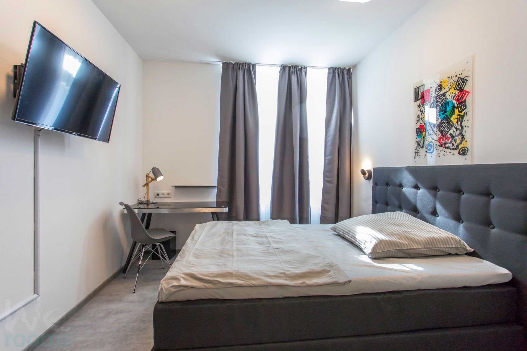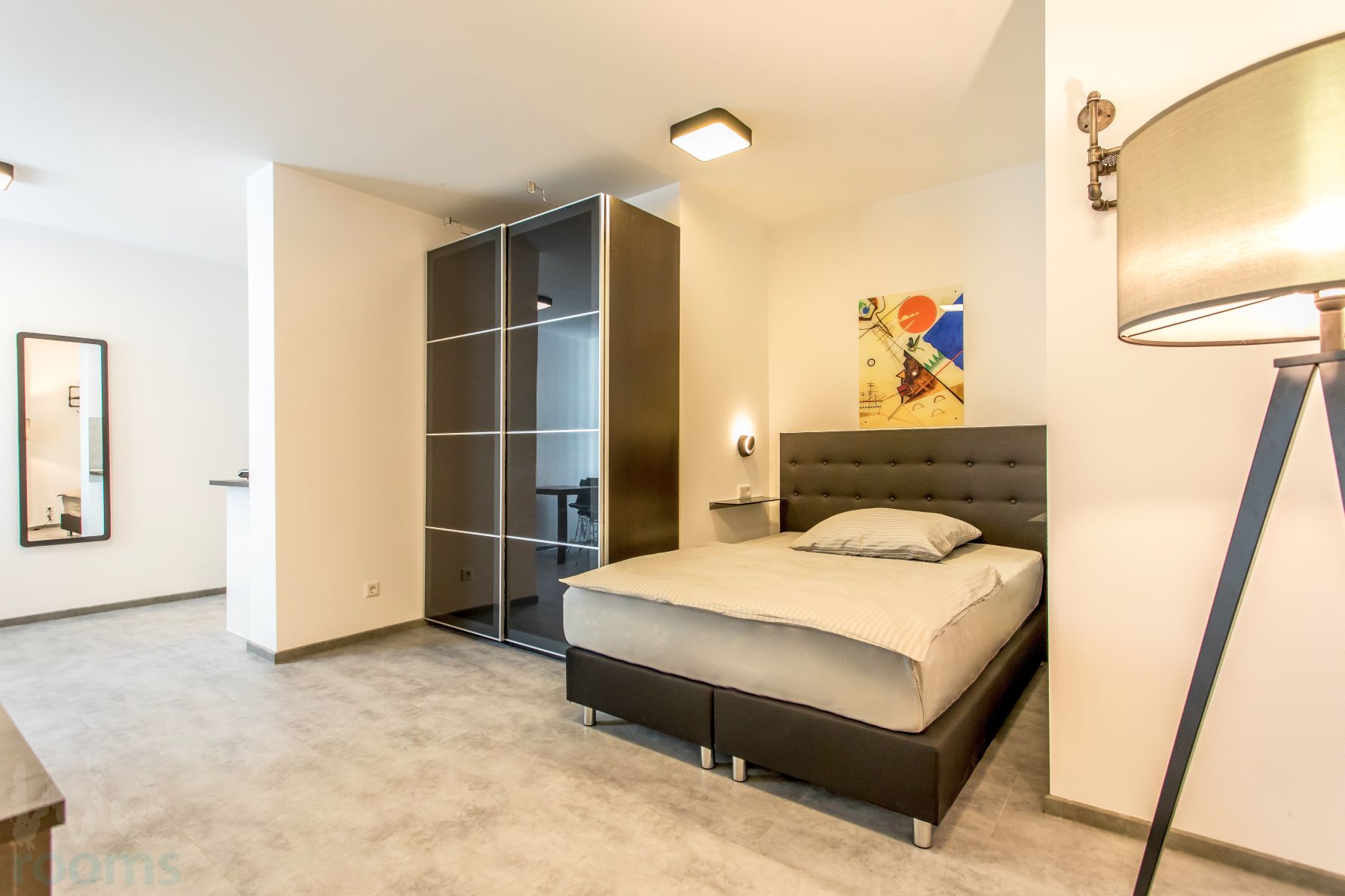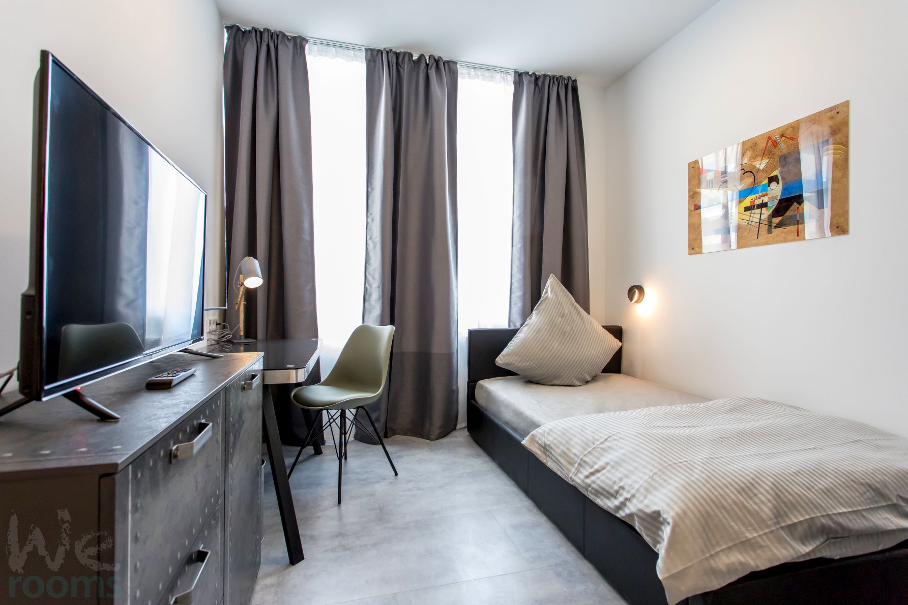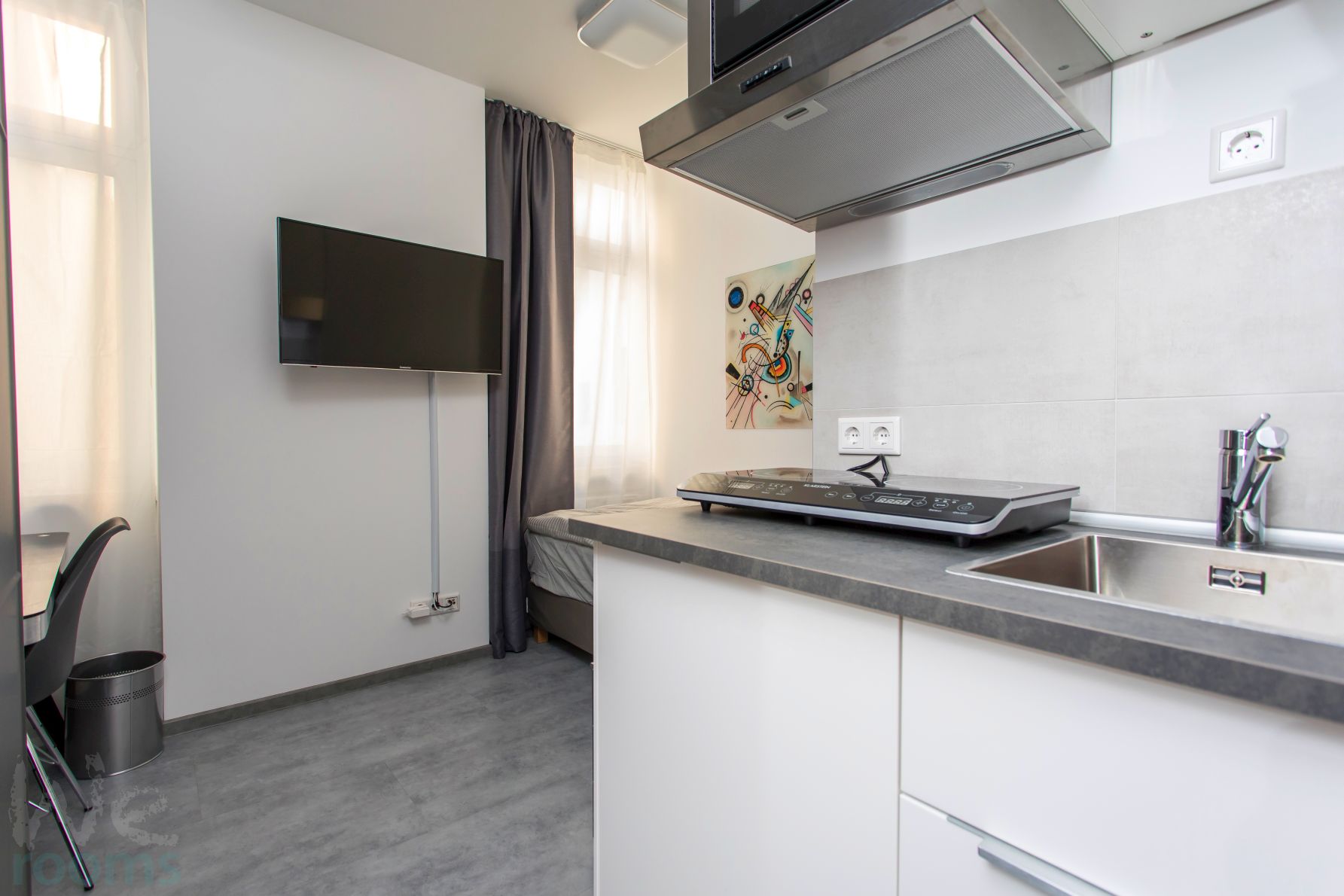 Die Ausstattung des Apartments beinhaltet ein geräumiges Bett, Kleiderschrank, Flachbild TV, Nachttisch, Schreibtisch, Schreibtischstuhl, Bettzeug (Kopfkissen 80×80, Bettdecke 140×200) und die passende Bettwäsche. Darüber hinaus verfügt jedes Apartment über eine eigene Singleküche inklusive Induktionskochfelder und Kühlschrank und ein eigenes Badezimmer mit Dusche und WC.