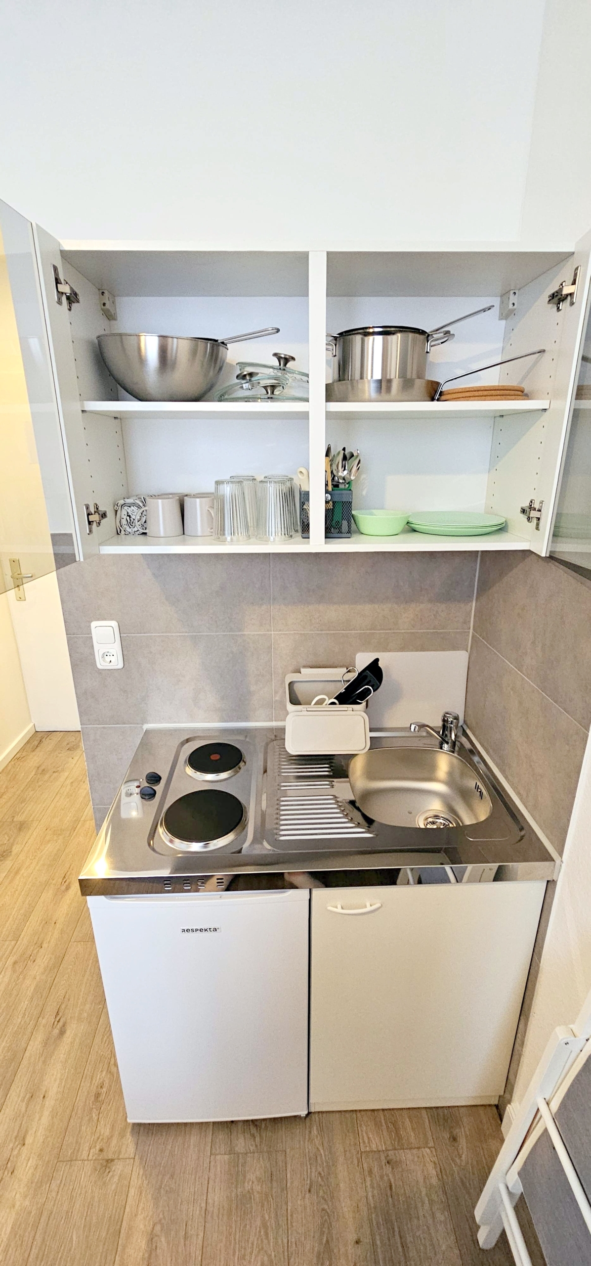 montiert ist. Die kompakte Küchenzeile verfügt über einen 2-Platten-Herd, eine Spüle, einen Kühlschrank sowie über sämtliches Koch- und Essgeschirr – darunter Teller, Gläser, Besteck und Kochutensilien.