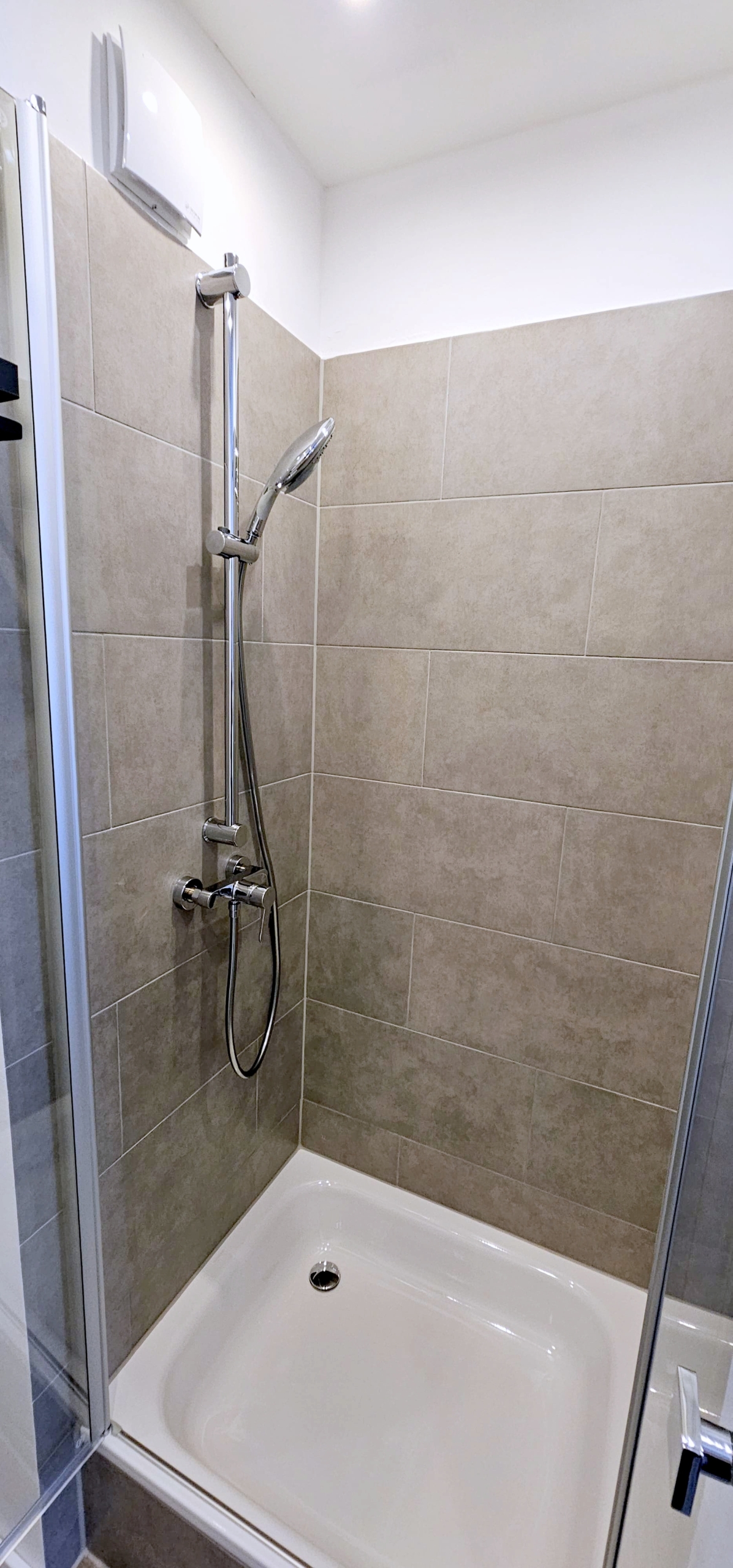 Das Badezimmer ist in moderner Fliesenoptik gehalten und mit Dusche und WC ausgestattet.