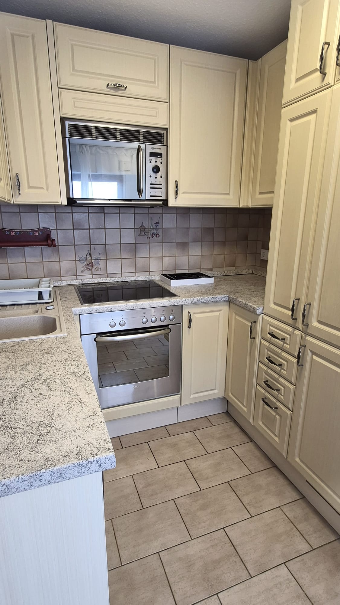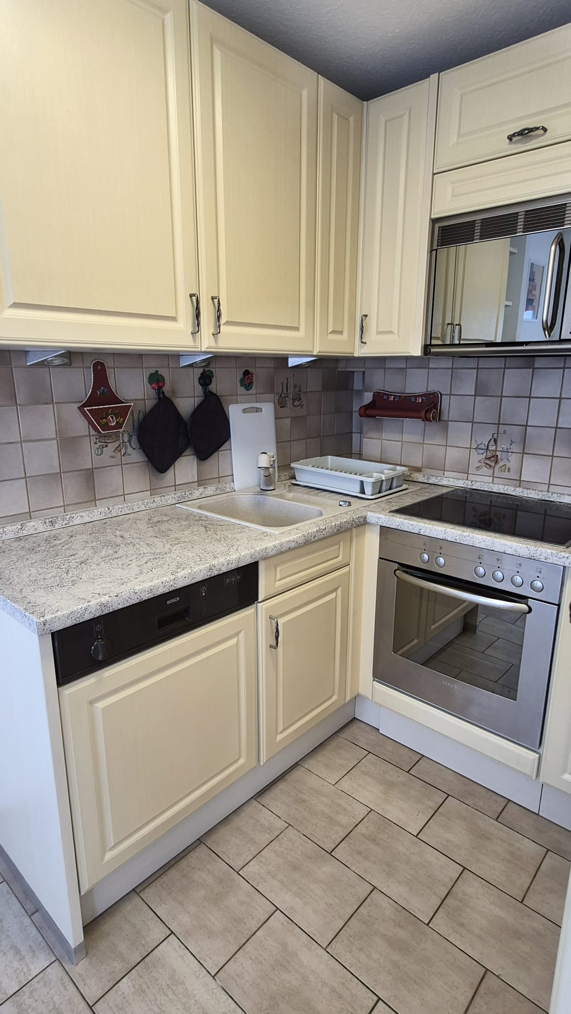 Die Einbauküche verfügt über Cerankochfeld, Backofen,