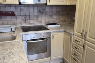 Die Einbauküche verfügt über Cerankochfeld, Backofen,