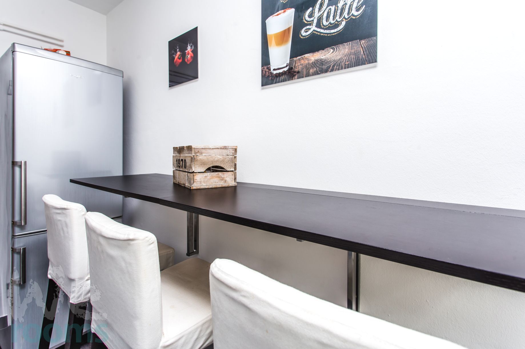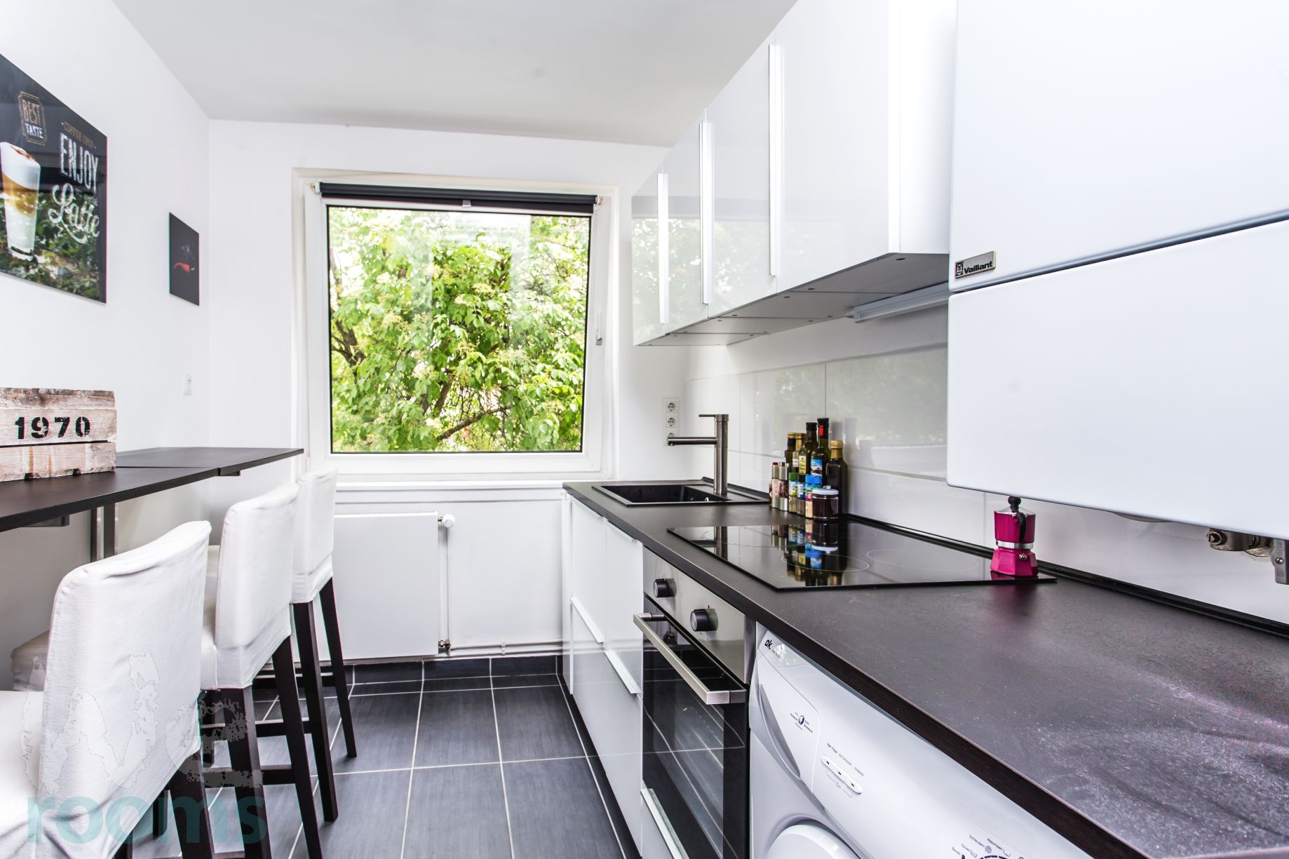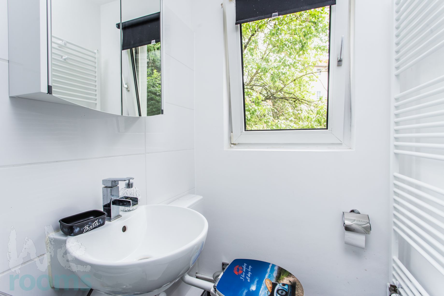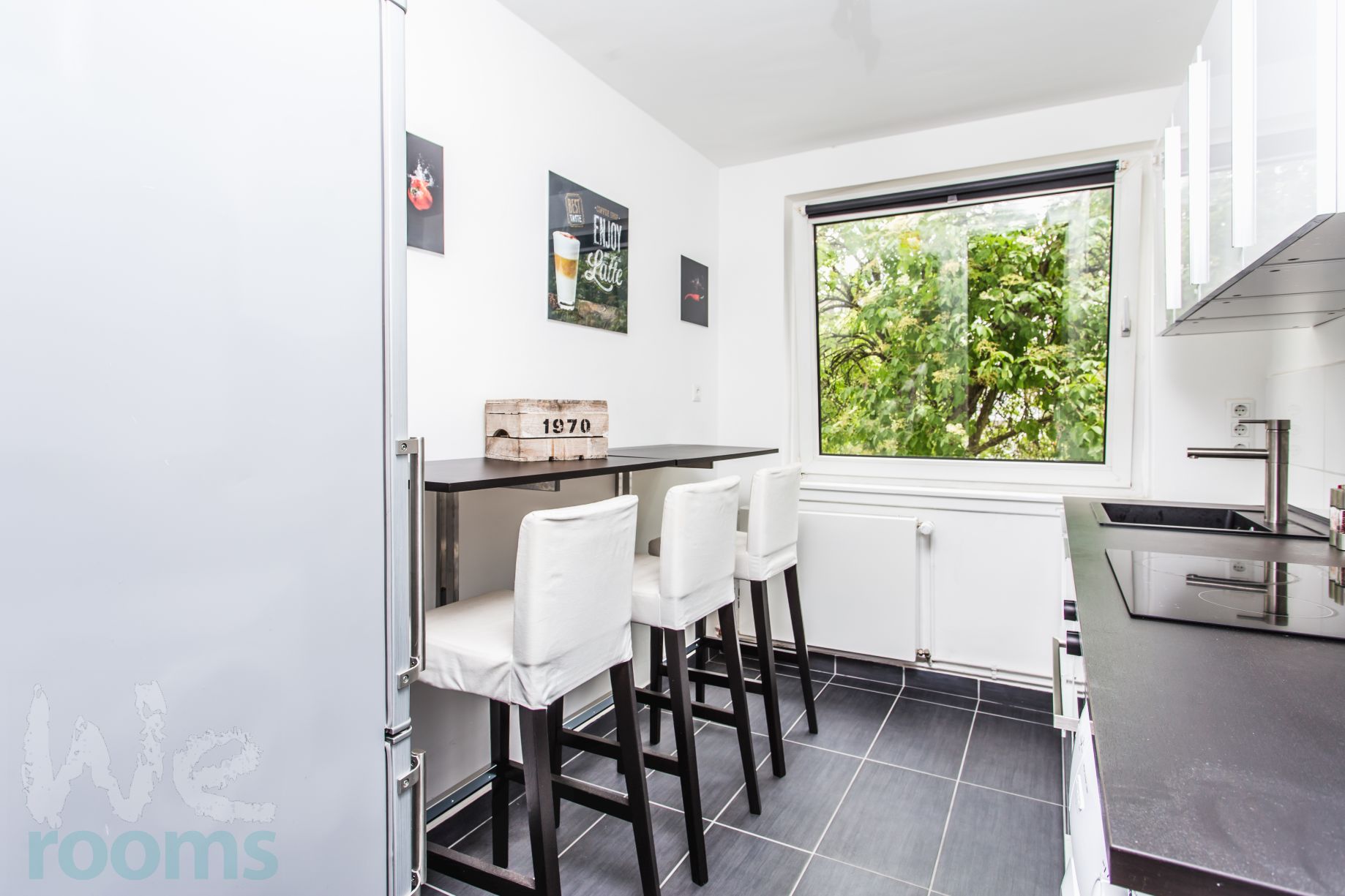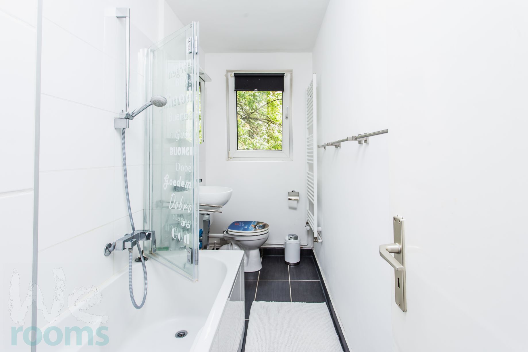 Im 1ten Stock des top gepflegten Mehrfamilienhauses bieten wir 3 modern eingerichtete Zimmer mit Bett, Kleiderschrank, Nachttisch und Schreibtisch an.  Eine komplette Einbauküche mit Kühlschrank, Elektroherd + Backofen und Sitzgelegenheiten, das innenliegende moderne Bad mit Badewanne zur gemeinsamen Nutzung der drei WG Bewohner.