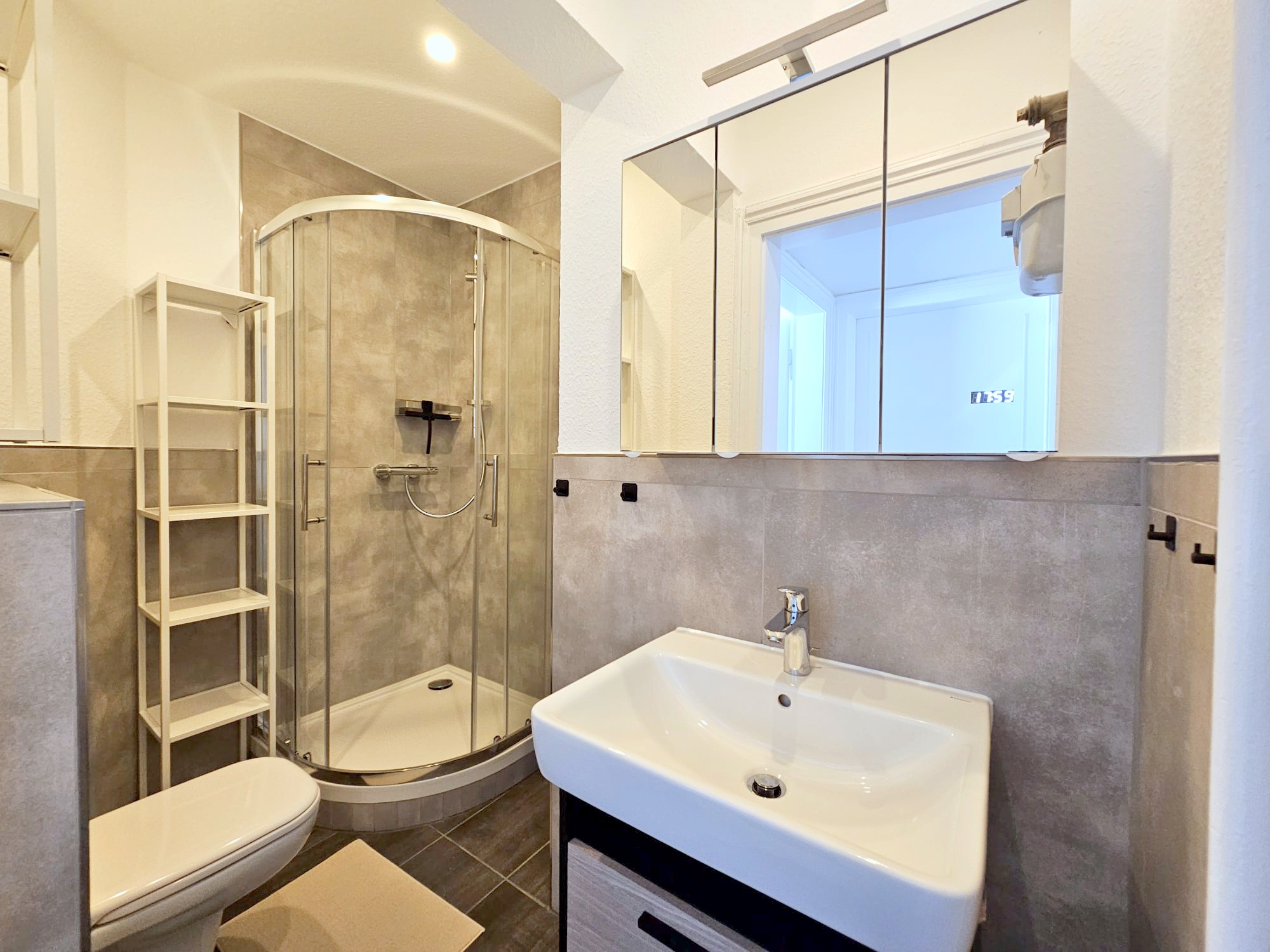 Badezimmer: Großzügig geschnitten, modern gefliest, mit Dusche, Spiegel, Waschbecken und Abstellfläche Separates WC: Für zusätzliche Flexibilität im Alltag