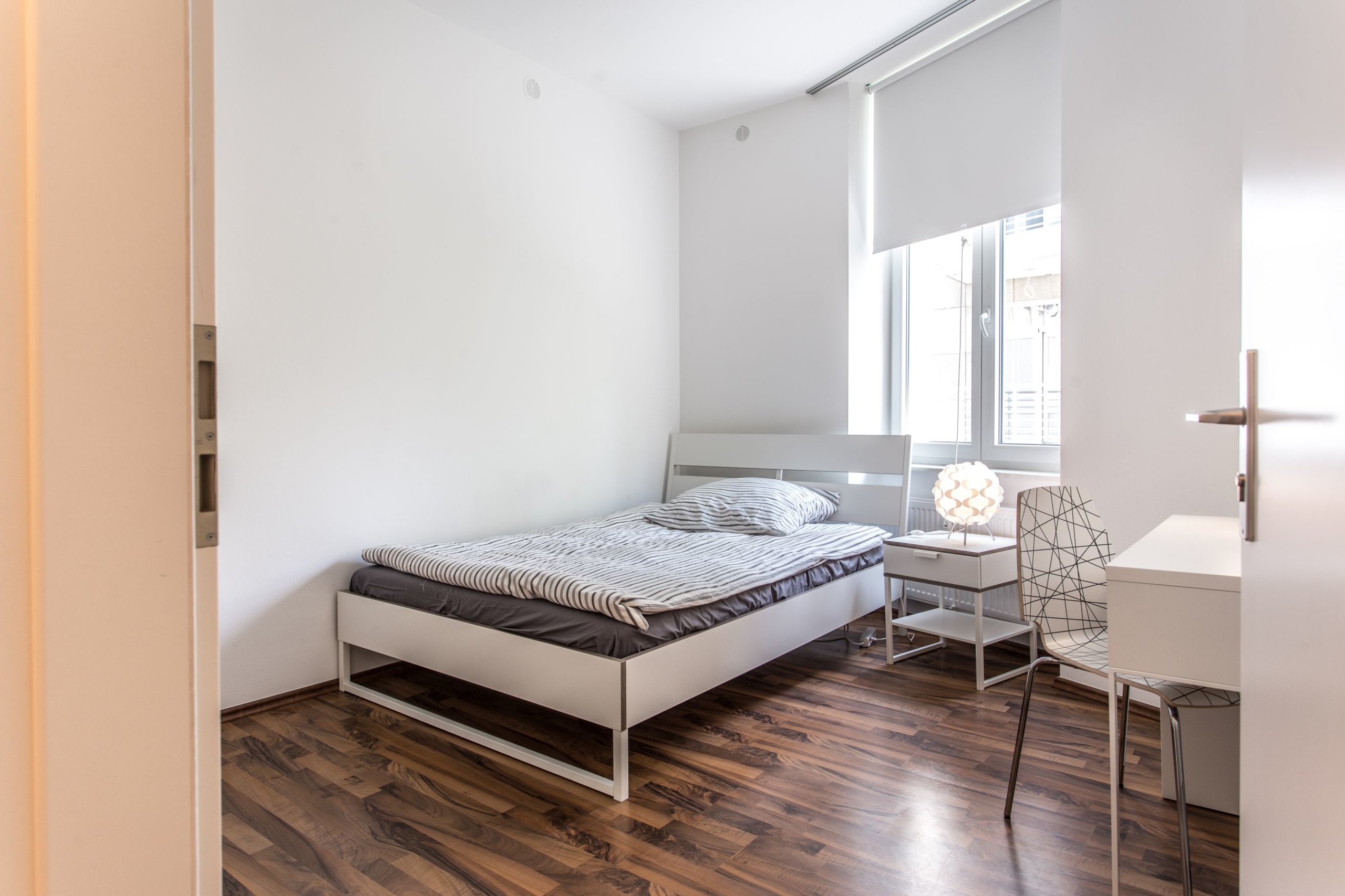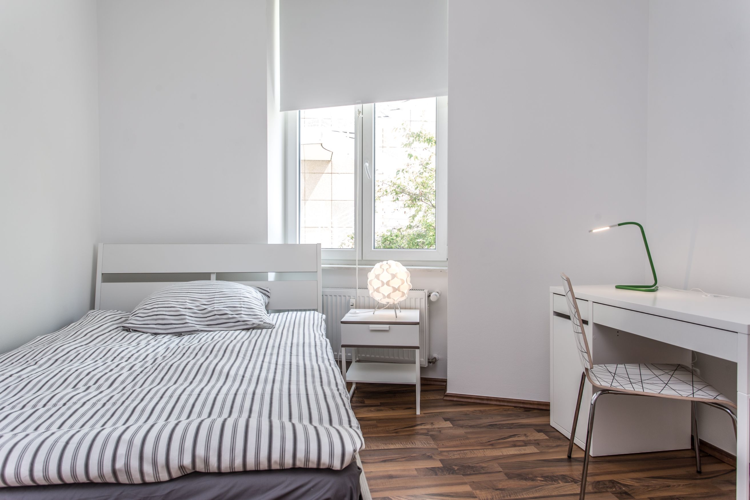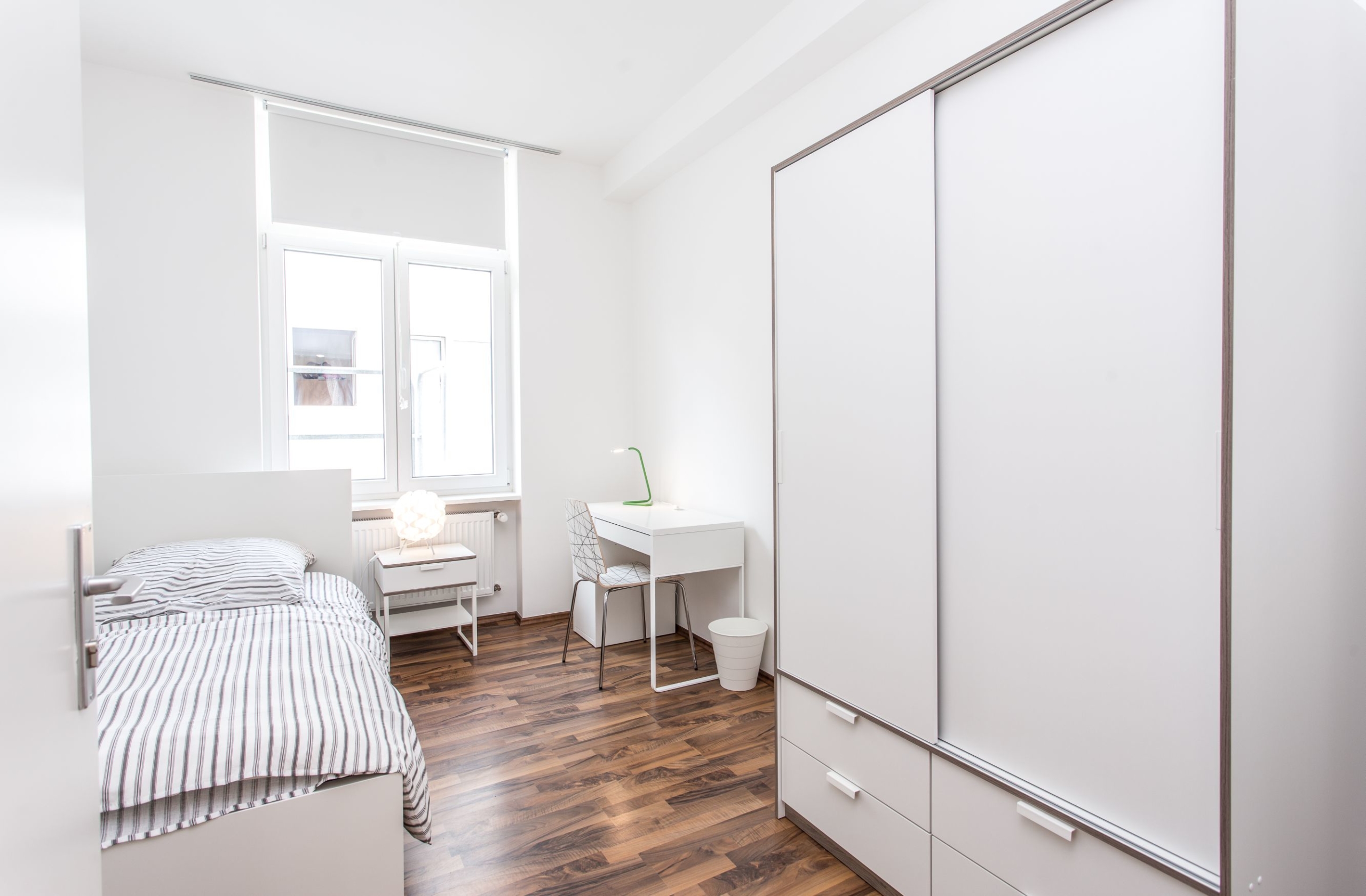Die Zimmer hier sind ausgestattet mit einem Bett, Kleiderschrank, Nachttisch, Schreibtisch, Schreibtischstuhl, Bettzeug (Kopfkissen 80×80, Bettdecke 140×200) und die passende Bettwäsche. Darüber hinaus verfügt die WG über einen zentralen kostenlosen WLAN Zugang (16.000 kBit/s) für alle WG Bewohner.
