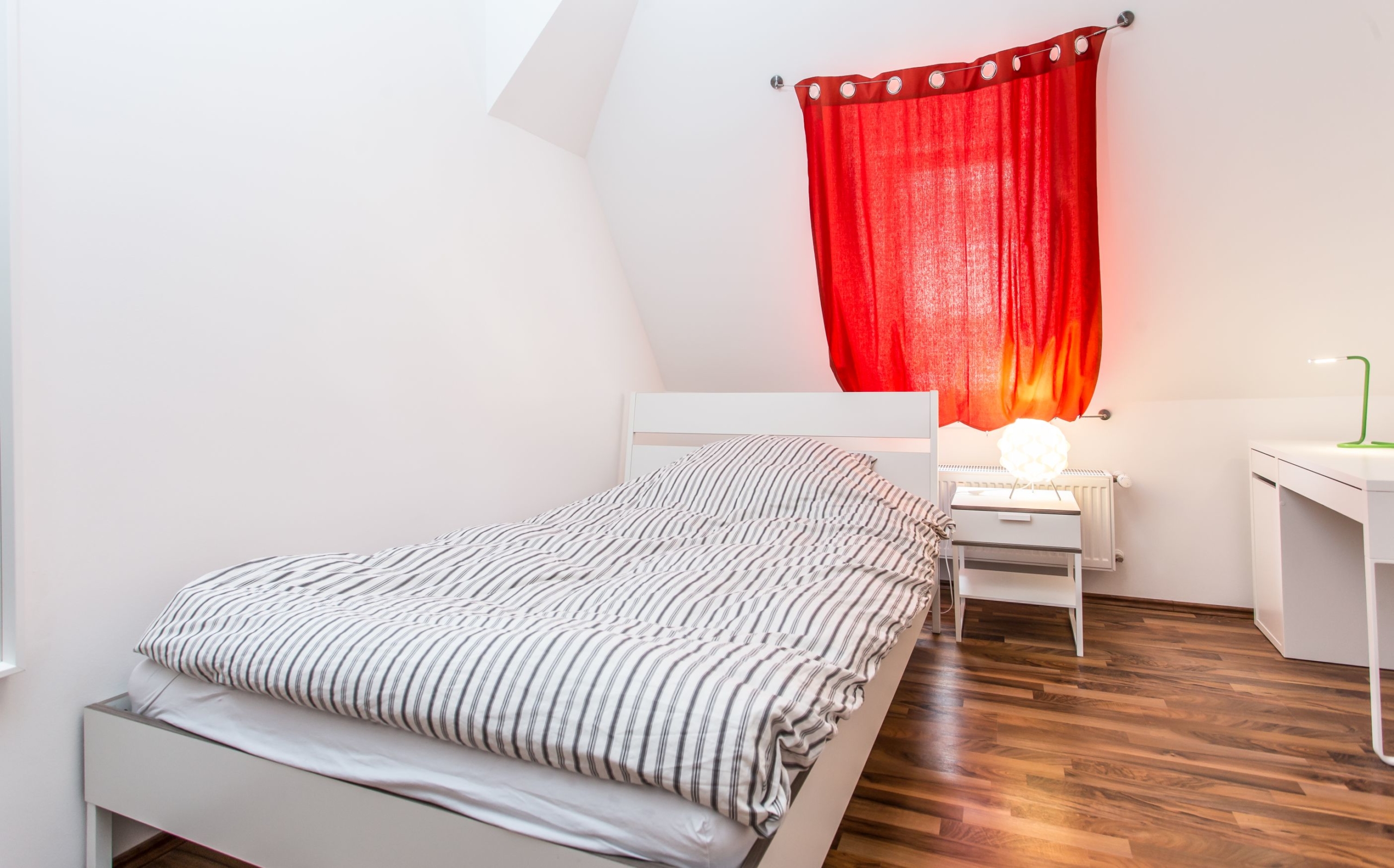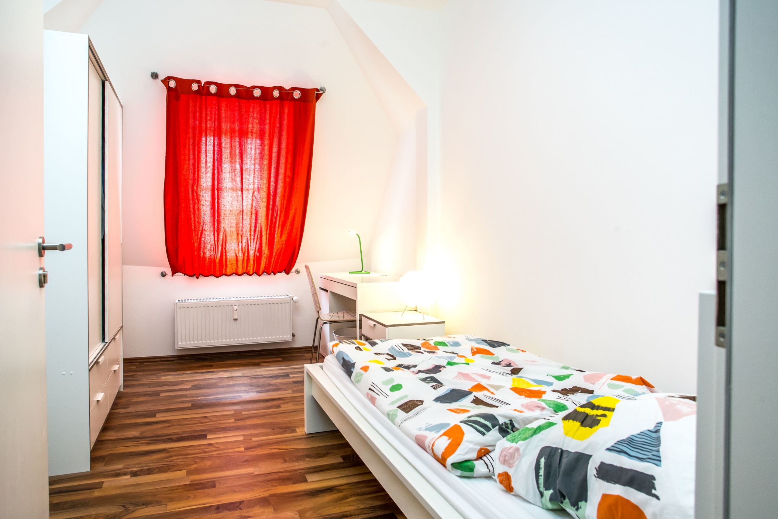 Die Zimmer hier sind ausgestattet mit einem Bett, Kleiderschrank, Nachttisch, Schreibtisch, Schreibtischstuhl, Bettzeug (Kopfkissen 80×80, Bettdecke 140×200) und die passende Bettwäsche. Darüber hinaus verfügt die WG über einen zentralen kostenlosen WLAN Zugang (16.000 kBit/s) für alle WG Bewohner.