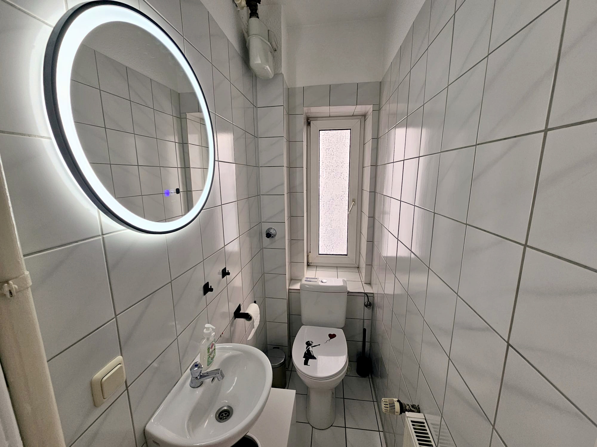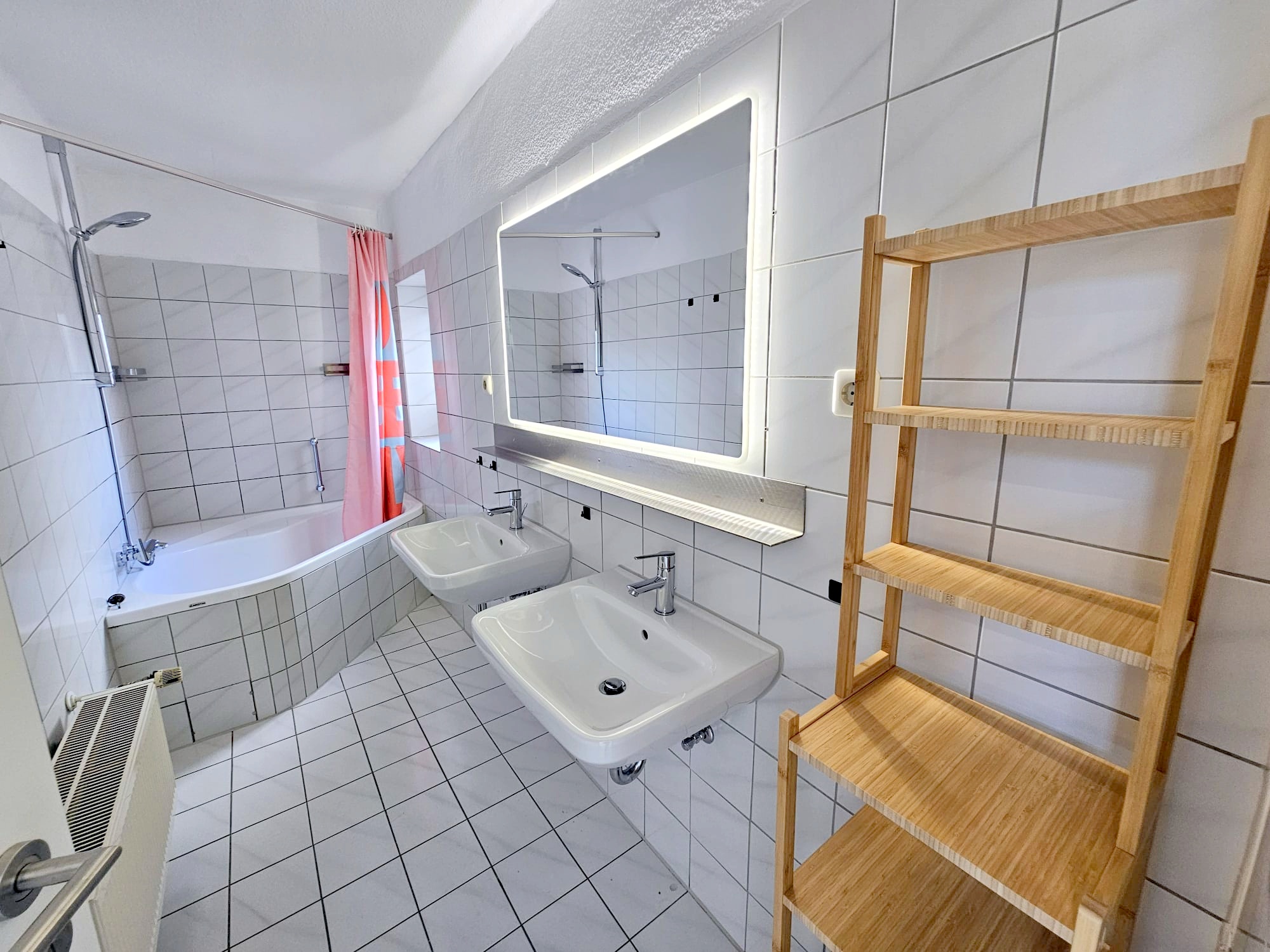 Badezimmer: Großzügig geschnitten, modern gefliest, mit Dusche, Spiegel, Waschbecken und Abstellfläche Separates WC: Für zusätzliche Flexibilität im Alltag