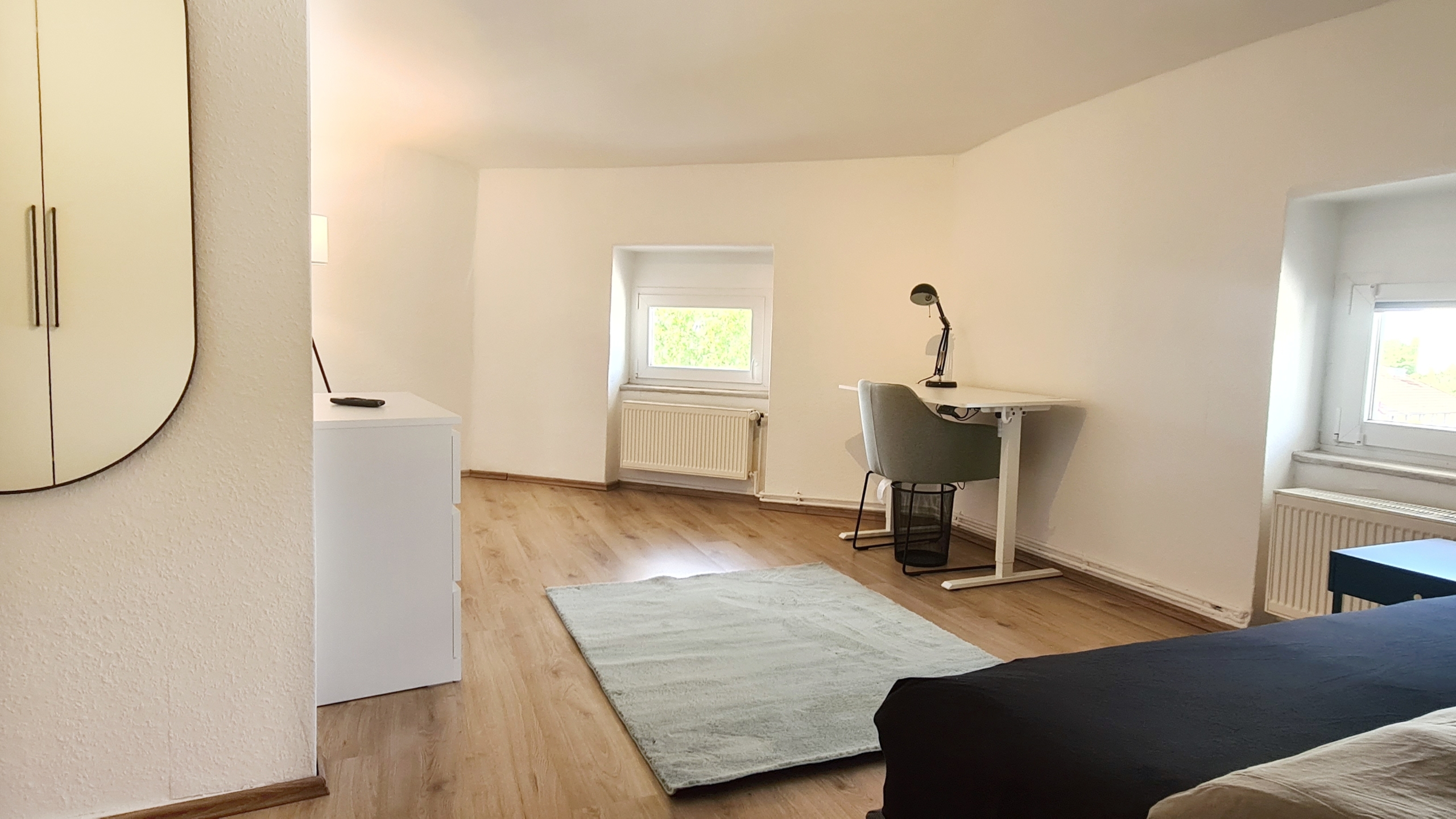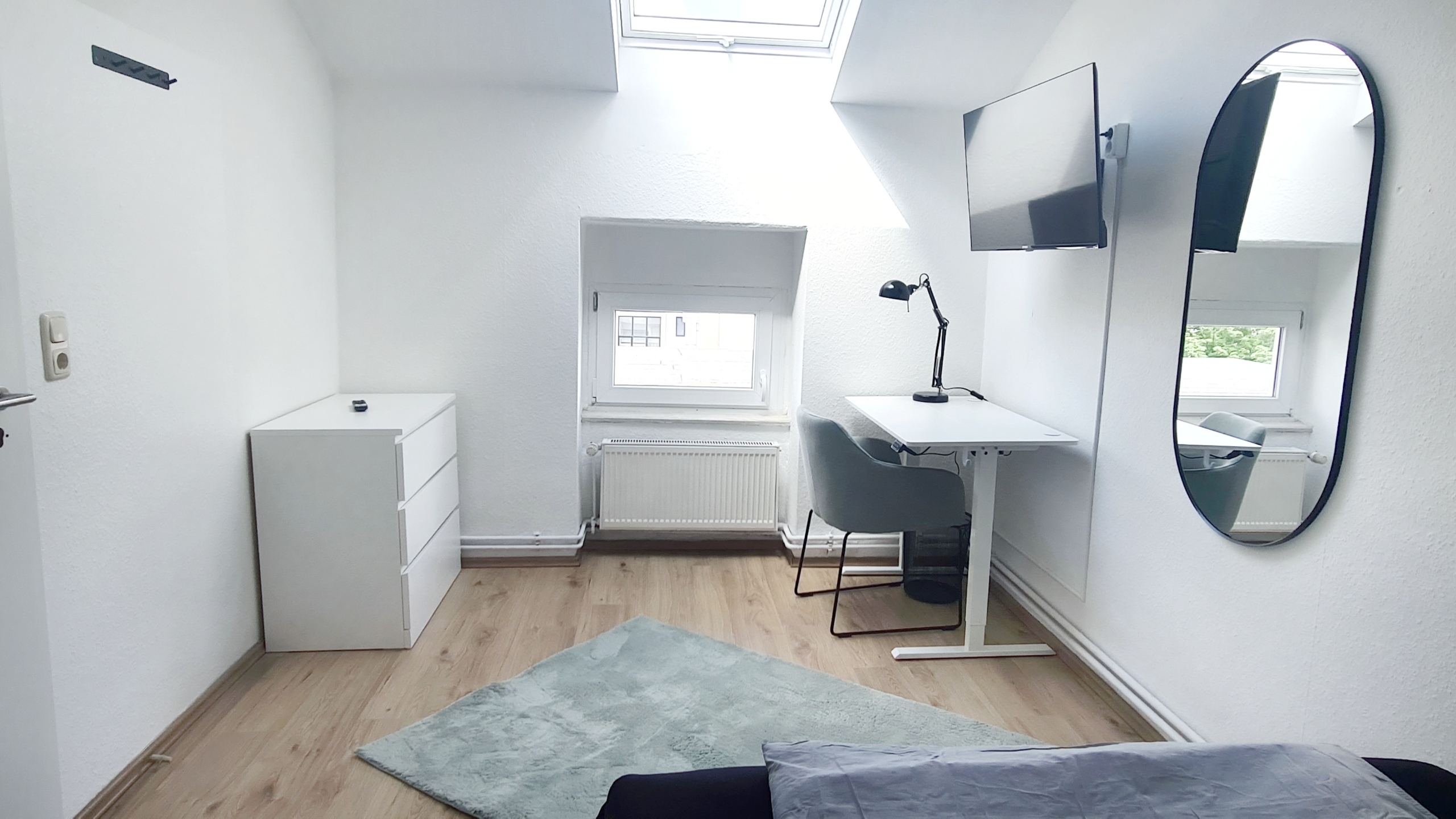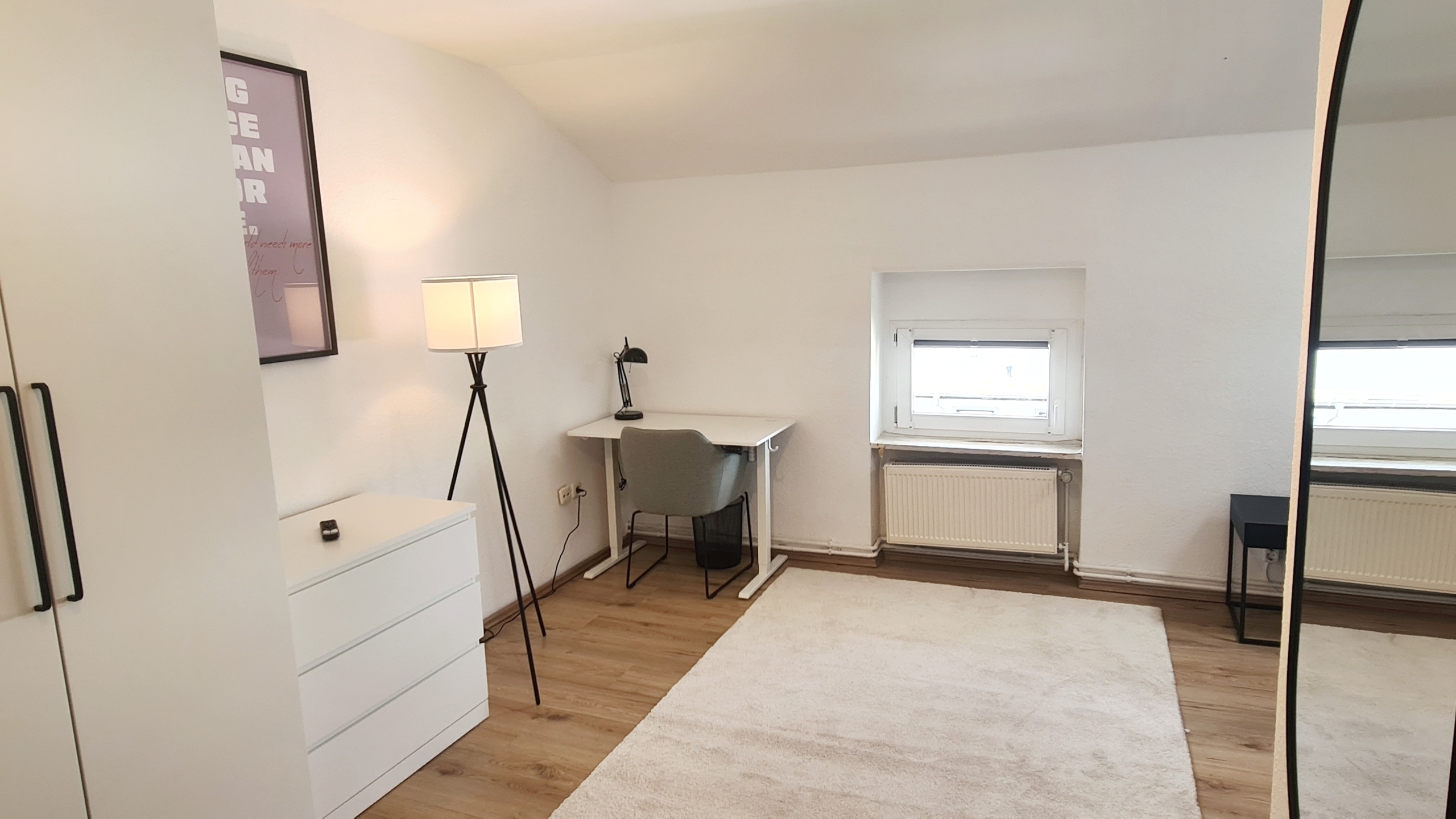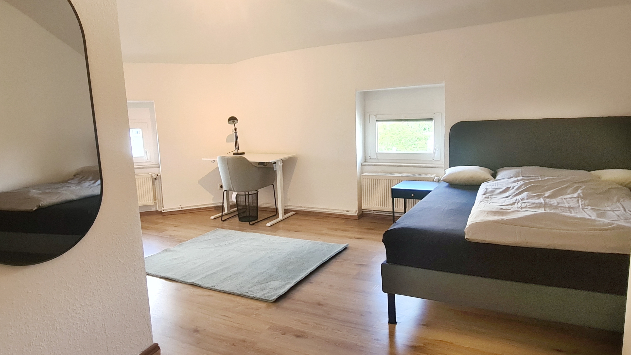 Alles modern möbliert, jedes Zimmer natürlich einzeln absperrbar. Zimmerausstattung (alle 4 Zimmer): Großes, gemütliches 1.40m Boxspringbett Verdunkelungsvorhänge und helle Fensterfronten für viel Tageslicht Großer Kleiderschrank in Hochglanzoptik Schreibtisch mit Stuhl und Lampe – ideal fürs Arbeiten oder Lernen Teppichläufer, moderne Beleuchtung und Wanddeko