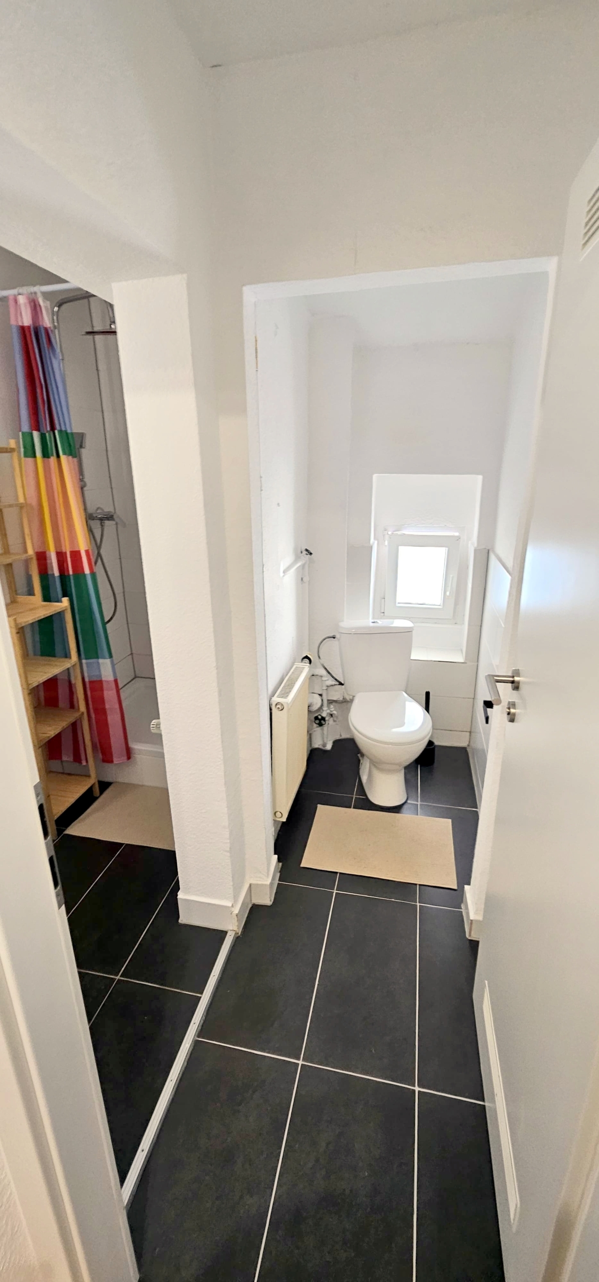 Badezimmer: Großzügig geschnitten, modern gefliest, mit Dusche, Spiegel, Waschbecken und Abstellfläche Separates WC: Für zusätzliche Flexibilität im Alltag