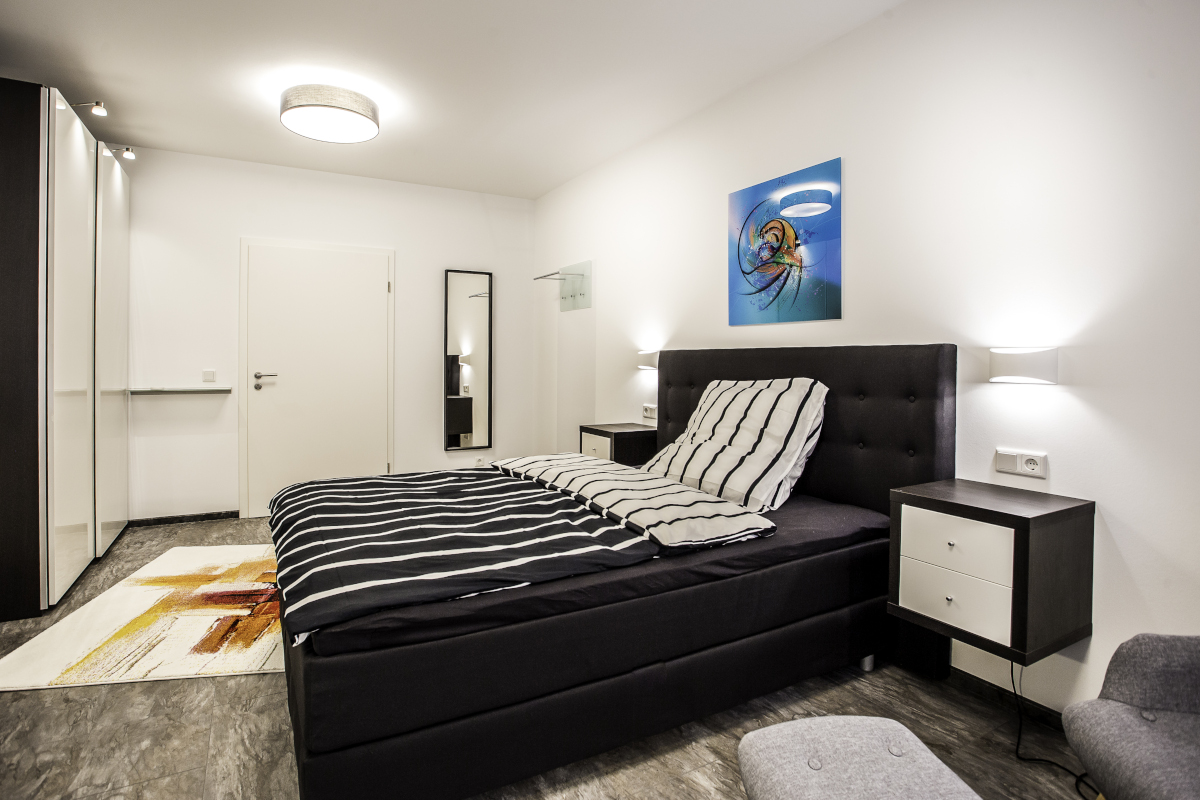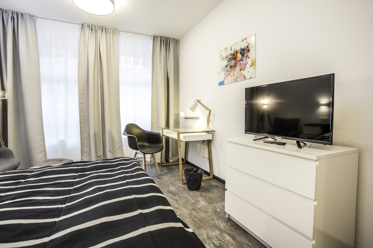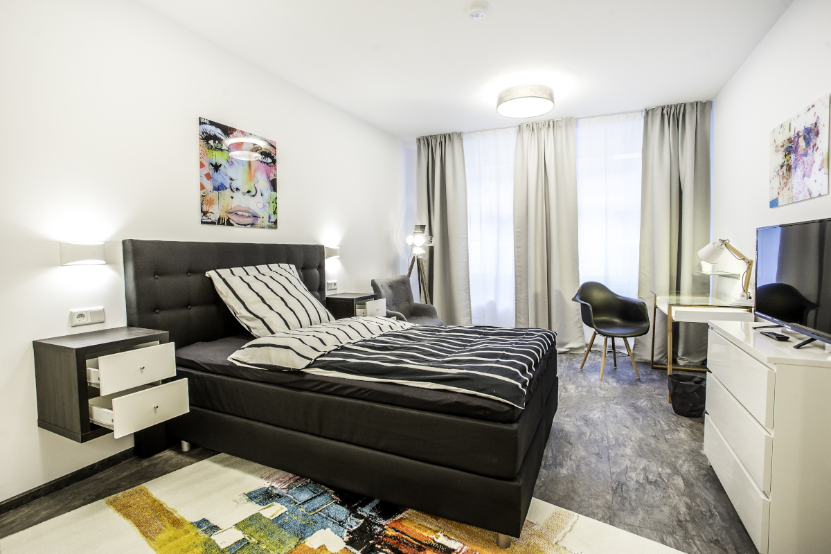 Die Ausstattung des Zimmers beinhaltet ein geräumiges Bett, Kleiderschrank, Flachbild-TV, Nachttisch, Schreibtisch, Schreibtischstuhl, Bettzeug (Kopfkissen 80×80, Bettdecke 140×200) und die passende Bettwäsche.