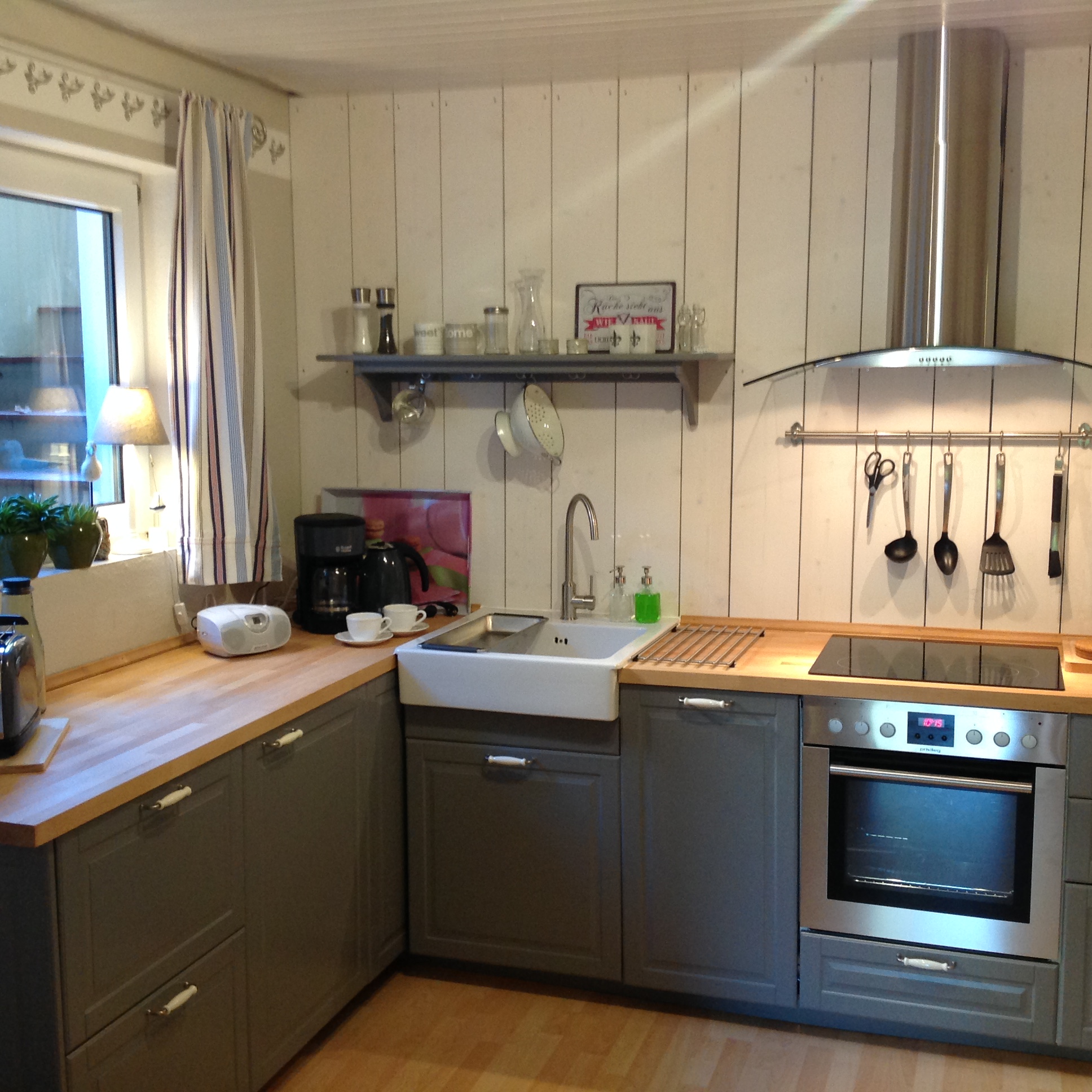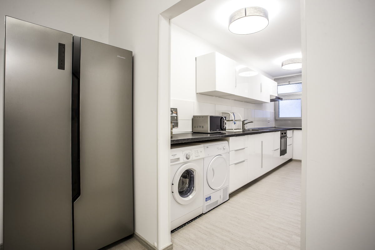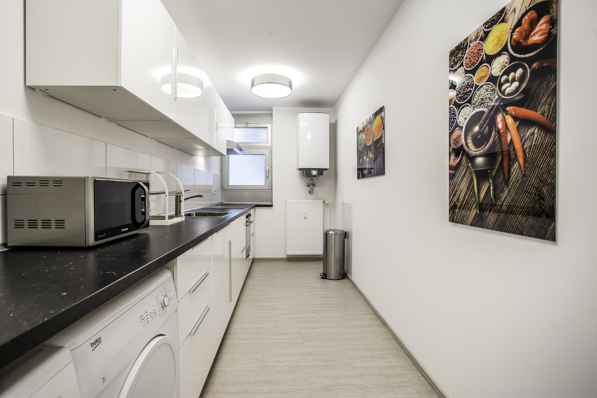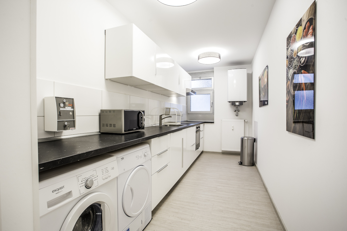 In der WG Wohnung gibt es einen komplett mit Geschirr, Besteck und Kochgeschirr eingerichteten, offenen Küchenbereich mit Elektroherd, Mikrowelle, Spülmaschine, sowie Sitzgelegenheiten für die gemeinsame Nutzung aller WG Bewohner. Es steht zudem ein großer Side-by-Side Kühl-Gefrierschrank zur Verfügung.