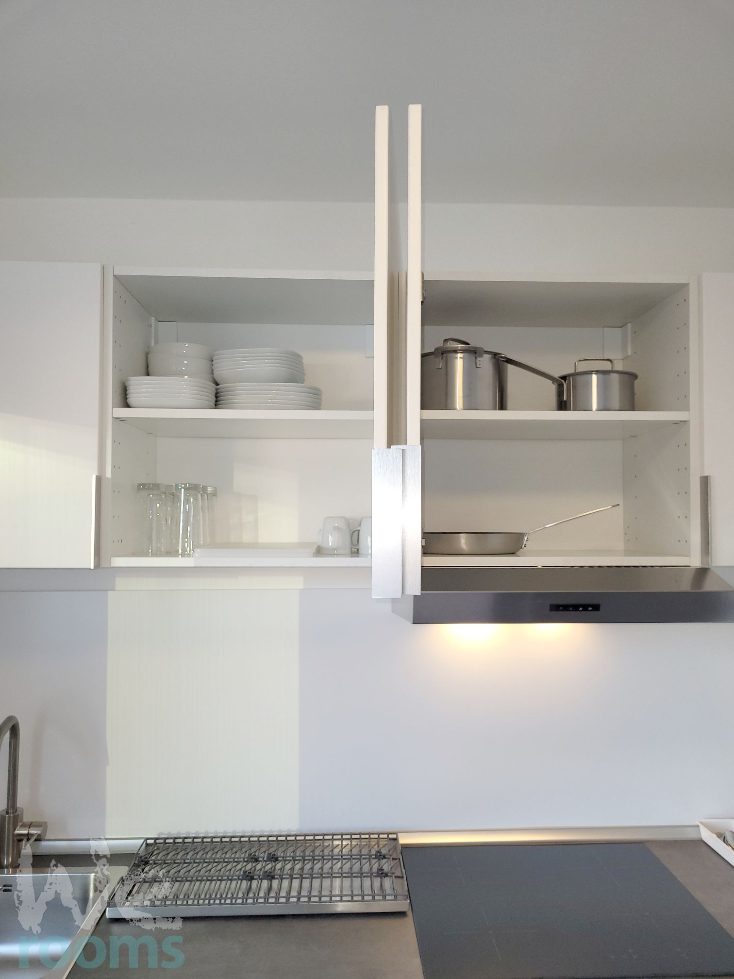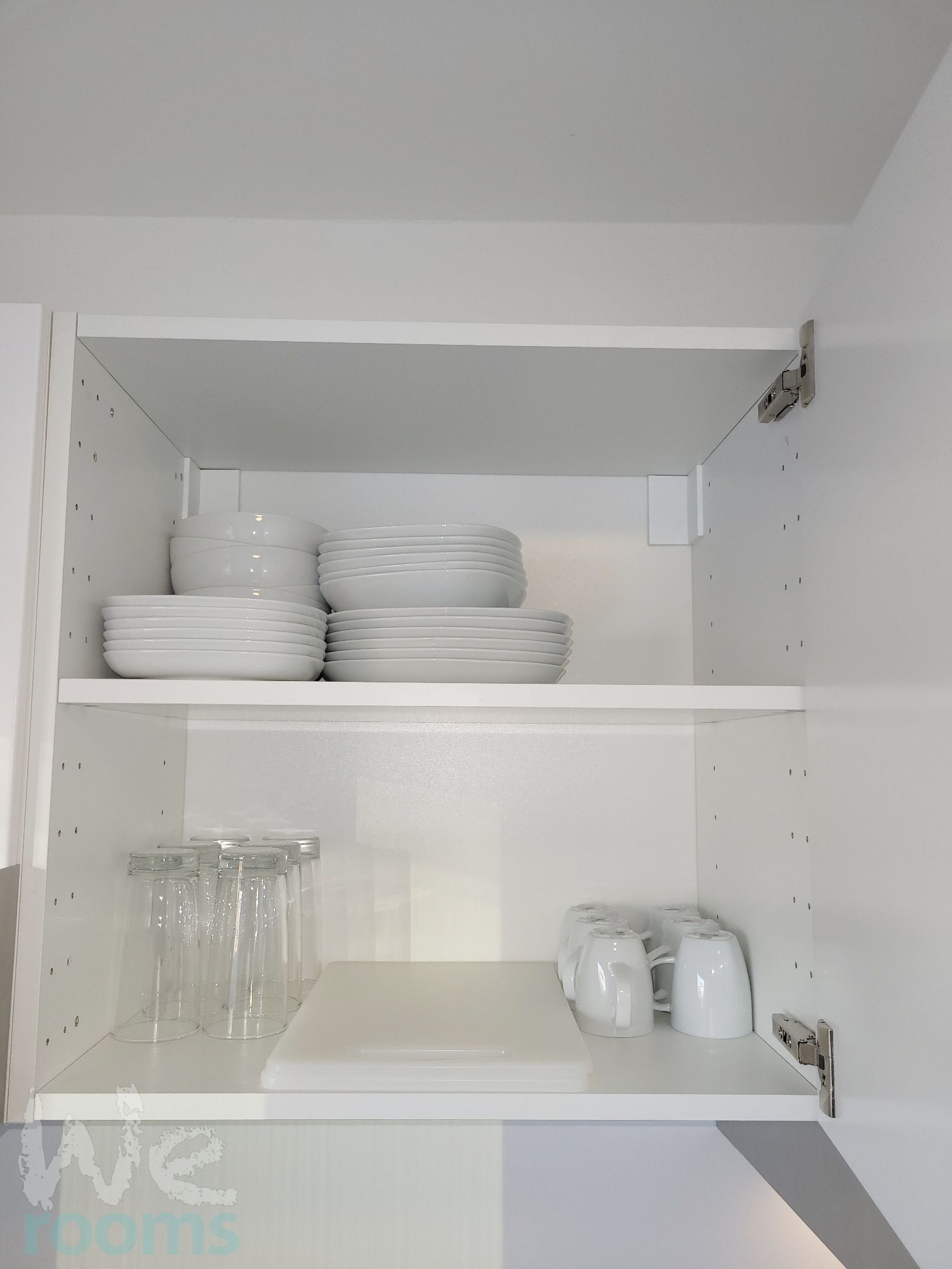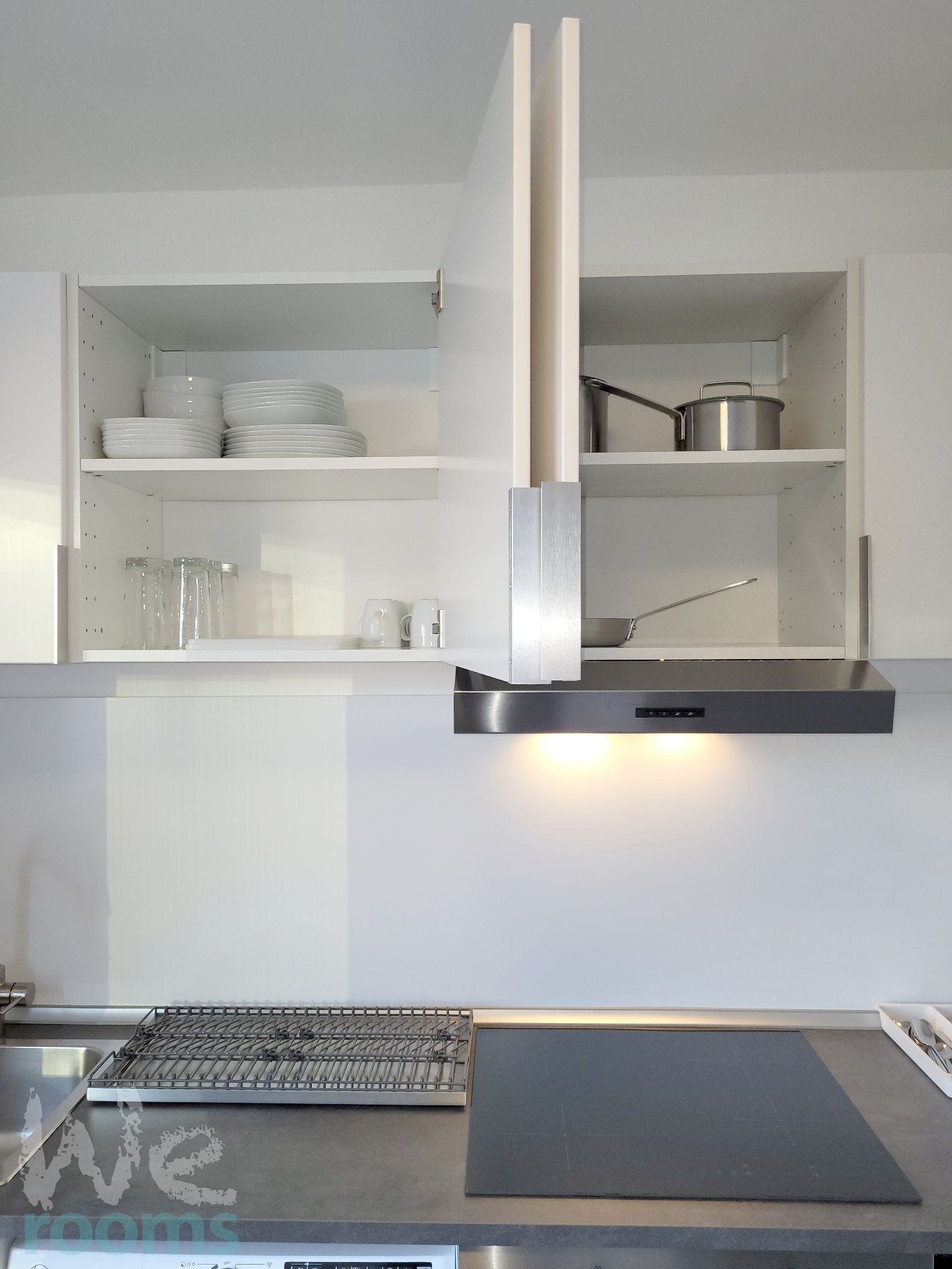 Die Küche ist komplett eingerichtet und auch schon mit Besteck/Geschirr ausgestattet. An das Bügeleisen und Bügelbrett wurde ebenfalls gedacht.