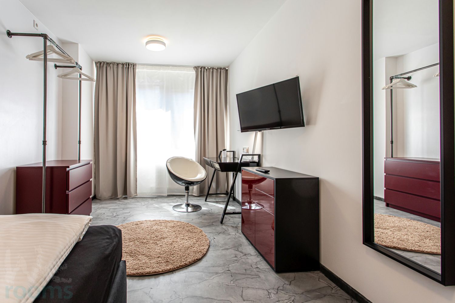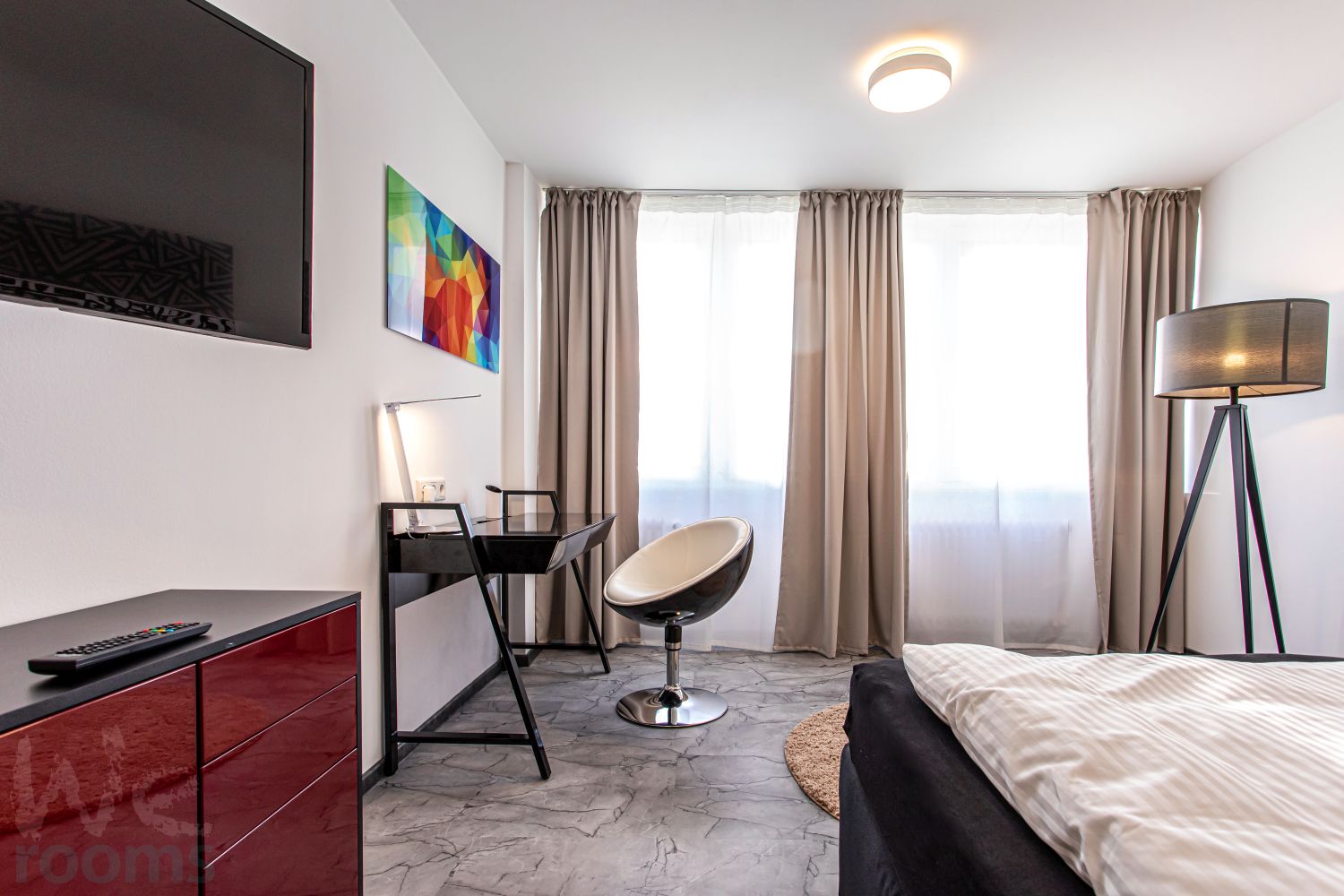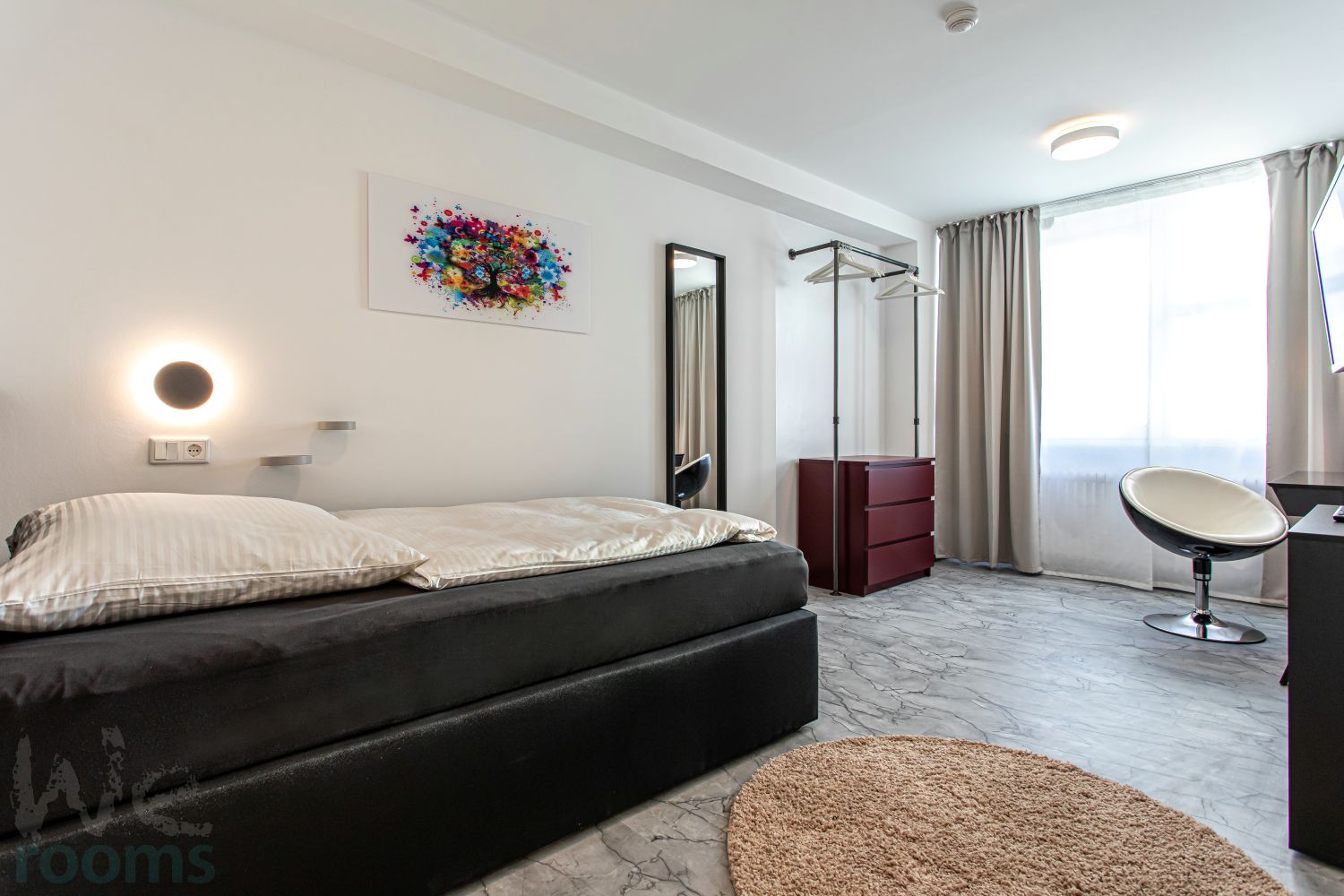 Die Zimmer beinhalten ein geräumiges Bett, einen offenen Kleiderschrank, Flachbild-TV, Nachttischablage, Schreibtisch, Schreibtischstuhl, Bettwäsche (Kopfkissen 80×80, Bettdecke 140×200) und die passenden Bettbezüge. Zusätzlich ist jedes Zimmer der Etage mit einem eigenen WLAN-Router mit ausgestattet.